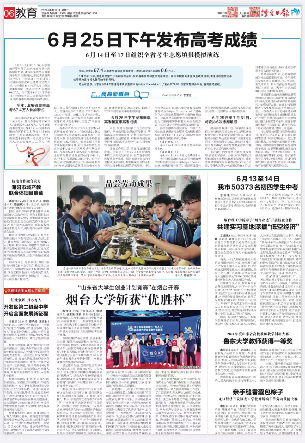 《烟台日报》6月12日06教育版刊发《“山东省大学生创业计划竞赛”在烟台开赛 开云kaiyun登录入口斩获“优胜杯”》