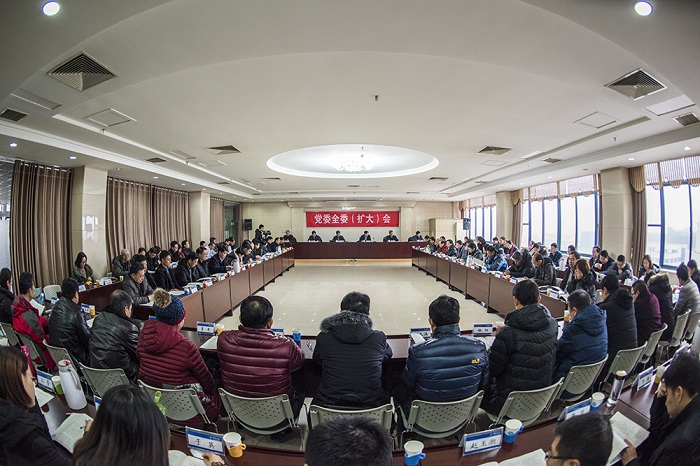 1月16日上午,学校在综合楼六楼中厅会议室召开党委全委(扩大)会议,回顾总结2017年工作,研讨审议2018年工作要点,并安排部署寒假工作。校领导张伟、郭善利、孙祥斌、邓昌亮、宋中民、周胜良以及党委委员出席会议。校纪委委员、教学单位和直属单位党政主要负责人、部处室主要负责人、两代表一委员、民主党派负责人代表以及教师代表列席会议。会议由党委常委、副校长孙祥斌主持。