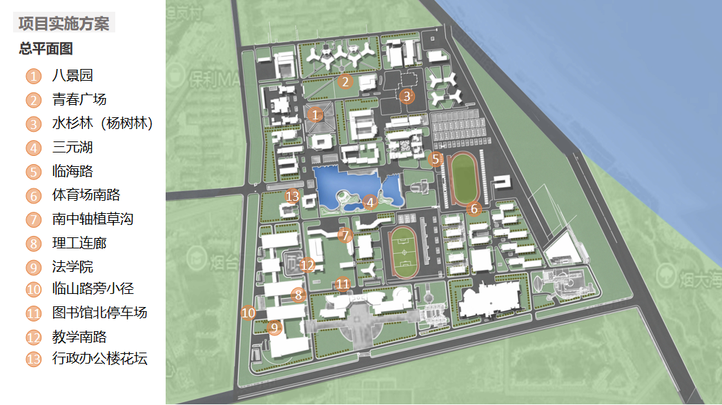 本次海绵城市改造工程项目在透水铺装改造的基础上还对学校多处景观进行了升级美化,包括杉树林及配套,青春广场透水铺装及周围树木更换,三元湖清淤堤岸整治及景观提升,教学南路、办公楼北侧人行路透水铺装,临海路、体育场南路两侧人行路透水铺装及部分树木更换,法学院内庭院周围绿地海绵改造,临海路雨水收集排放设施改造升级,逸夫图书馆北侧停车场改造及学生公寓门口内涝防治等。
