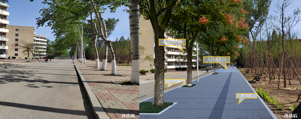 此次学校海绵工程改造还包括了校园内部分地区的树种更换工作。据悉,目前校园里有不少地方绿化较为杂乱,一些树木长势一般,甚至有水泥花砖被树根顶起,导致路面凹凸不平。结合目前现状,经细致调研与论证,学校决定对青春广场南侧、临海路、教学南路和体育场南路等地部分树木进行树种更换,选取北美红枫、速生白蜡、北方栾树等树种进行栽植。这些树木生长较快且造型美观,具备观赏价值,都有着耐寒、耐旱、耐湿、耐涝的品种特点。