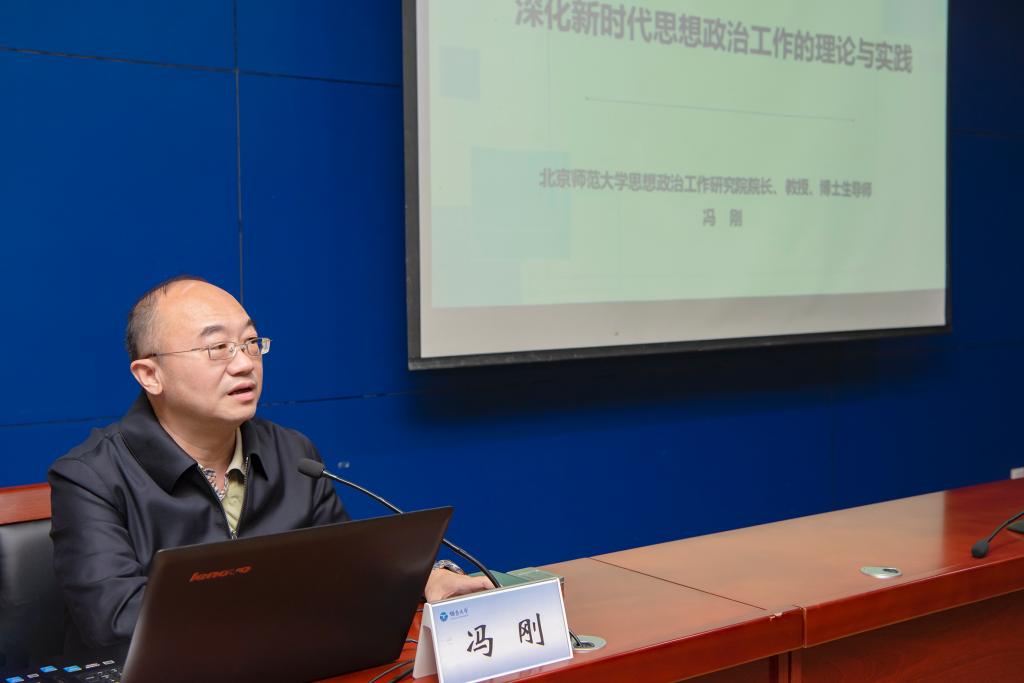 冯刚教授围绕高校思想政治工作队伍业务能力提升这一主线,从党对思想政治工作的新要求、新时代思想政治工作的重点内容、思想政治教育的时代建构等方面,多层面、多角度、多维度展开阐述。他指出,新时代高校思想政治工作队伍必须始终坚持“为党育人、为国育才”的根本任务,根据时代特征、青年特征加强认识、明确定位,探索和把握高校思想政治工作规律,做好新时代思想政治工作的整体设计和体系构建,从理论和实践两个层面持续推进思想政治工作的改革和落实,全方位提升高校思想政治工作育人效果。报告站位高远、视野宏阔、思想前瞻,具有很强的思想性和理论性,对深化新时代高校思想政治工作、搭建“大思政”格局具有很强的指导性和针对性。会后,冯刚教授还就思想政治教育学科的时代构建以及新时代大学生思想引导等问题同与会教师进行探讨,并提出指导性意见及建议。